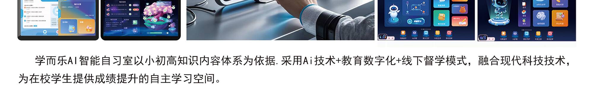 企业核心业务包括:学而乐学能教室、学而乐A智能自习室、学而乐巧解题、学而乐A1学习机、师资培训营、师资特训营、学霸特训营、助学精英锻造营等。